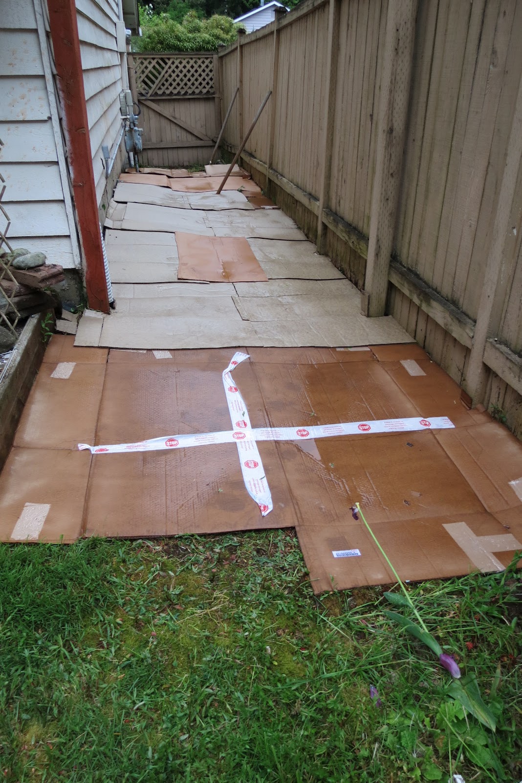 Tonight we laid down cardboard along the side of our house as the first layer in our lasagne. I wet it down real well and will start piling things on top tomorrow. This is the south side of our house and where we are planning to put raspberries. First we have to conquer years of neglect. Will lasagne layering work? I hope so. Another thing to learn.